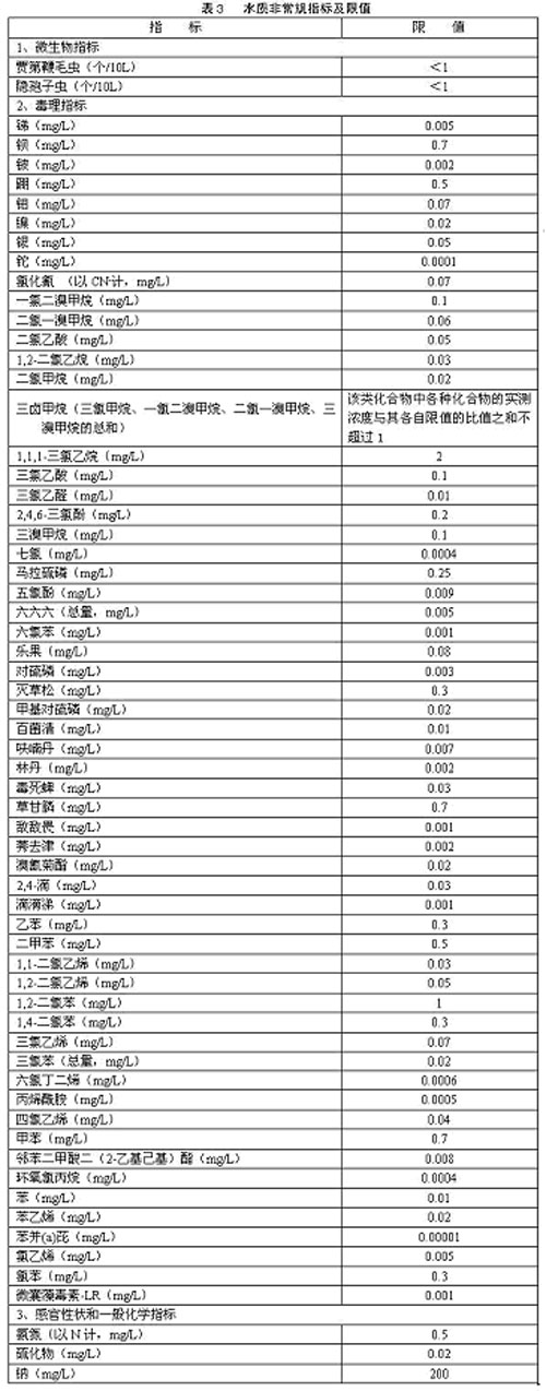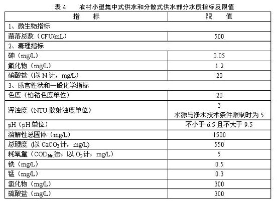 4.1.7 農村小型集中式供水和分散式供水的水質因條件限制,部分指標可暫按照表4執行,其余指標仍按表1、表2和表3執行。