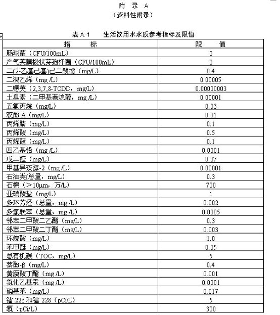 4.1.8 當發生影響水質的突發性公共事件時,經市級以上人民政府批準,感官性狀和一般化學指標可適當放寬。 4.1.9 當飲用水中含有附錄A表A.1所列指標時,可參考此表限值評價。