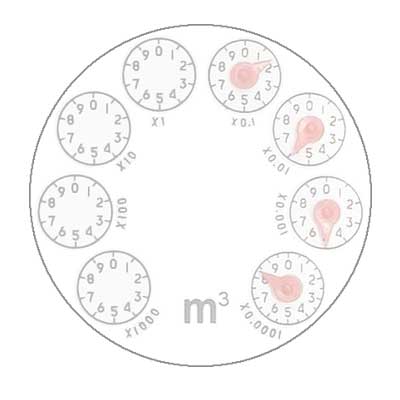 準(zhǔn)確抄表方法: 1、從表面的正方向看,不要側(cè)看或斜看; 2、從左到右抄讀四位黑針的指示數(shù)值,依此為: 千位(x1000), 百位(x100 ), 十位(x10), 個位(x1); 3、在對應(yīng)的位置點(diǎn)擊下拉框,選擇數(shù)字,填入指示數(shù)值; 4、紅針為小數(shù)不計。